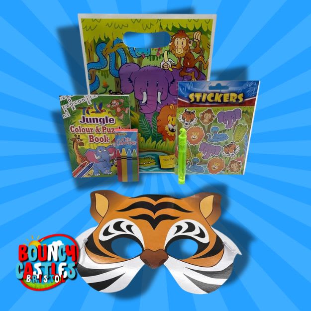 Each jungle party bag includes a Jungle Colouring & Puzzle Book, jungle stickers, and a jungle mask (with multiple animal designs) that will transform every child into their favourite jungle creature. To add extra fun, we've included a bubble wand and four wax crayons to spark creativity and keep the adventure going. With space to write each guest’s name, these personalized party bags are the perfect way to make your event extra special.