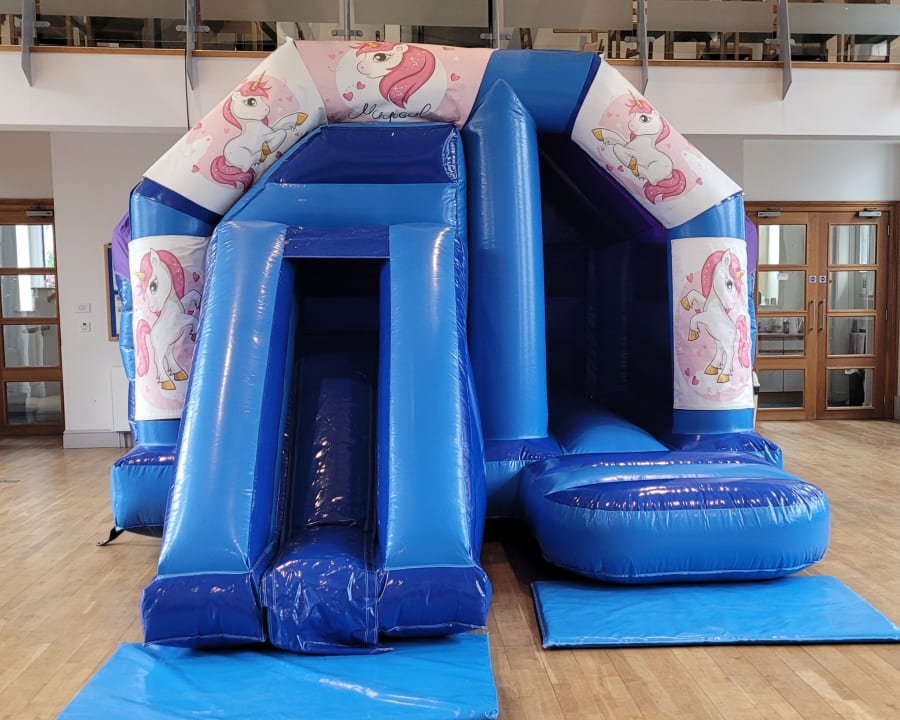 Unicorn Blue Bouncy Castle with Slide Hire Bristol